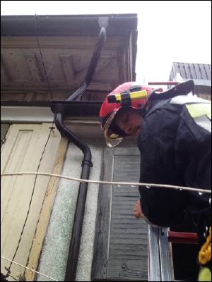 Massnahmen: Wohnung 1. OG und Dachterasse kontrollieren, Regenwasserläuft wegen verstopfter Dachrinne die Fassade herunter und ins Gebäude; mit Hilfe Steckleiter diverse Dachrinnen reinigen