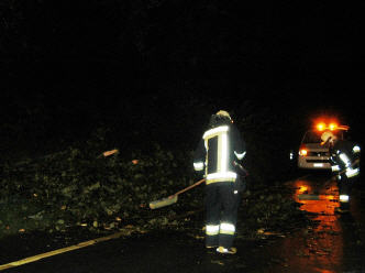 Lage beim Eintreffen: Baum nach Gewittersturm umgeknickt auf Strasse; eine Strassenseite noch befahrbar