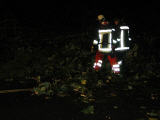 Massnahmen: Strassensicherung erstellen und Einsatzort mit Rüstwagen beleuchten, Baum mittels Motorsäge zerlegen und entfernen; Fahrbahn reinigen.