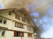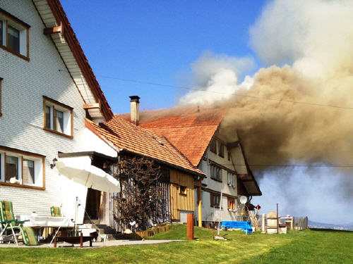 Lage beim Eintreffen: Gleichzeitig mit TLF Waldstatt eingetroffen; Brand Erdgeschoss und 1. Stock mit Übergriff auf Dach; starker Verrauchung unter dem Dach Personen vor Gebäude