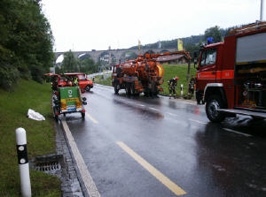 Massnahmen: Oelbindemittel streuen, Verkehrsregelung und Umleitung organisieren, Strassenentwässerungs-Schächte auf Oelspuren kontrollieren, Dichtkissen setzen, Kanalreinigungsfima aufbieten, Kanal und Schächte reinigen