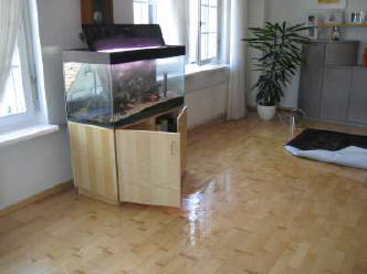 Lage beim Eintreffen: Aquarium (ca. 400 Liter Wasser) hat sich auf Wohnzimmerboden entleert, mehrere Fische sind verendet