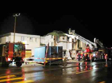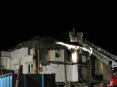 Lage beim Eintreffen: Teile eines Wohnhauses sind abgebrochen und provisorisch abgedeckt. Regenwasser rinnt in die Baukonstruktion des zu erhaltenden Hausteils.