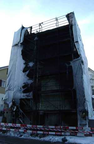 Lage beim Eintreffen: Brand aussen am Gebäude 1. Boden; Übergriff auf Gerüstabdeckung und Gerüst sowie Fenster 1. bis 3. Boden; Atemgifte ab 1. Boden