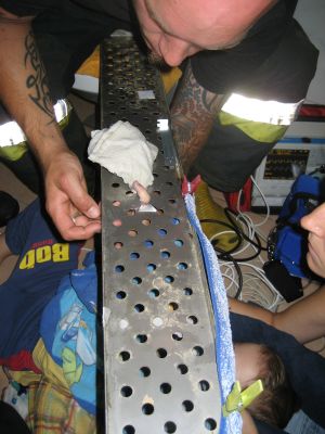 Massnahmen: Patient auf Boden legen um ruhig zu stellen, geschwollener Finger mit Eiswasser kühlen, Rettungsdienst aufbieten, unter Anästhesie und mit Hilfe eines Eisensägeblattes Blech um Finger vorsichtig wegtrennen