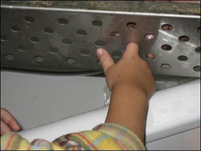 Lage beim Eintreffen: 4-jähriger Knabe hat Finger in Entwässerungsrinnenabdeckung aus Chromstahlblech mit runder Stanzung gesteckt; Finger sitzt fest und ist angeschwollen