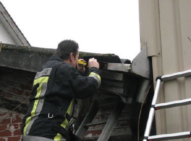 Lage beim Eintreffen: Katze Leila (seit 3 Tagen vermisst) ist zwischen Eternit - und Unterdach eingeschlossen und kann sich nicht mehr selbst befreien.
