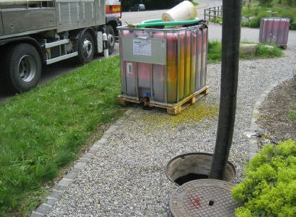 Lage beim Eintreffen: Mitarbeiter und Kanalreiningungsfirma sind am auffangen und umpumpen einer grossen Menge ausgelaufener Farbe; Schadendienst Amt für Umwelt vor Ort