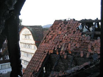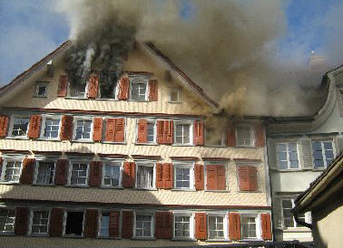 Bemerkungen: Die beiden um 1790 erbauten Häuser wiesen einen versteckten Hohlraum von 20cm Breite vom Keller bis ins Dach hinauf auf. Teilweise bestanden die Aussenwände aus einer ausgemauertem Riegelkonstruktion, teilweise nur aus einer Schalung. Ein einer später angebauten Stelle war im Hohlraum eine Bretterfassade vorhanden, welche die vertikale Ausdehnung des Brandes massiv begünstigte.