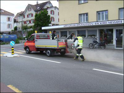 Massnahmen: Strassen und Kreuzungen sichern, Oelspur mit Bindemittel mittels Oeltiger abstreuen, bei Kreuzungen und Einlenker Oelbindemittel in Handarbeit auftragen, Strassenreinigungsfirma für Strassenreinigung aufbieten.