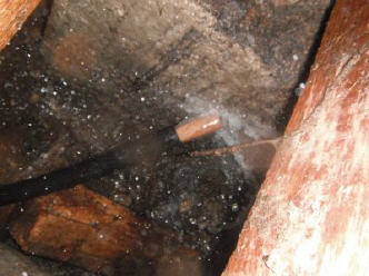 Lage beim Eintreffen: Wasseraustritt aus Plastik-Wasserrohr, provisorisch mit Besenstiel von Hausbewohner verschlossen.