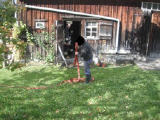 Massnahmen: Erkundung Einspeisung Wasserleitung, Schlauch-Kupplung von 40er Schlauch abgeschnitten, Schlauch über Wasserrohr gestülpt, mit Kabelbinder festgezogen und so das auslaufende Wasser aus Stall geführt. Zuleitung für Wasserrohr an einer oberen Liegenschaft gefunden, Leitung demontiert und so Wasseraustritt gestoppt.