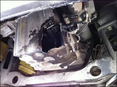Lage beim Eintreffen: Kiesplatz durch aufgerissene Oelwanne verschmutzt.