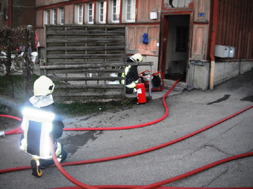 Massnahmen: Löschangriff 1. Atemschutztrupp im 1. Stock mit Druckleitung, Wärmebildkamera und Rauchverschluss; Kontrolle durch 2. Atemschutztrupp im 2. Stock auf Brandausdehnung mit Wärmebildkamera; offensive Lüftung Brandobjekt für Abzug der heissen Brandgase mit Lüfter und mit zweitem Lüfter als passiver Schutz für angebauten Gebäudeteil; zwei weitere Druckleitungen für Sicherung der Rauchaustrittsöffungen (Fenster und Dampfabzug Küche) erstellen; ADL für Löschangriff und allfälliger Dachöffnung vorsorglich bereitstellen; Wände und Decken öffnen für Nachlöscharbeiten.
