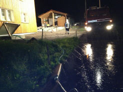 Lage beim Eintreffen: Bleichibach überläuft bei Einlaufbauwerk; Wasser läuft Wiese hinab zu Wohnhaus; Wassereinbruch im Keller