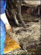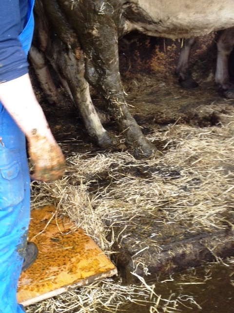 Lage beim Eintreffen: Tier durch Landwirt und ersten Offizier befreit, Kuh steckte mit rechtem Hinterlauf in eingebrochenem Schorrloch.
