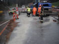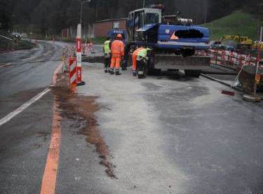 Lage beim Eintreffen: Öllache auf Strasse, Bauarbeiter haben bereits Ölbindemittel gestreut