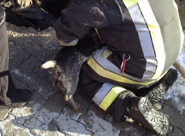 Massnahmen: erkunden, Hund kommt im Geröll nicht rückwärts, Katze weiter hinten erkennbar; Lage ausmessen; Privatfahrzeug umparkieren lassen; Verbundsteinplatz aufgraben und Loch zu Hohlraum bei Hund ausheben; Hund ergreifen und befreien; Hund anleinen und Aufgebot Polizei zur Halterbestimmung; Übergabe an Hundehalter; Schadenregulierung.