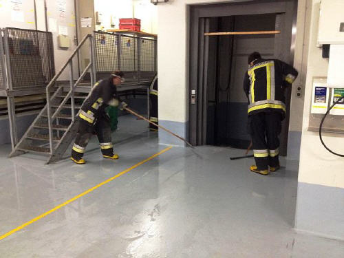 Lage beim Eintreffen: einige Milimeter Wasser im Untergeschoss auf grosser Fläche und in Liftschacht; Wasser weist Ph-Wert ausserhalb des neutralen Bereichs auf.