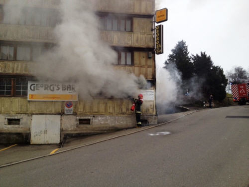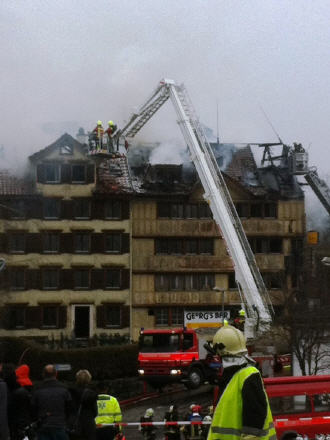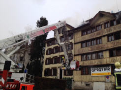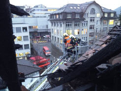Massnahmen: Brandbekämpfung im Erdgeschoss, 1. Obergeschoss und an Fassade; Strassen sperren; Alarmstufe erhöhen und HBRT Gossau aufbieten; Dach mit ADL öffnen; Brand mit bis zu 6 AS-Trupps gleichzeitig in beiden Hausteilen bekämpfen; Nachbarhäuser schützen; Glutnester löschen