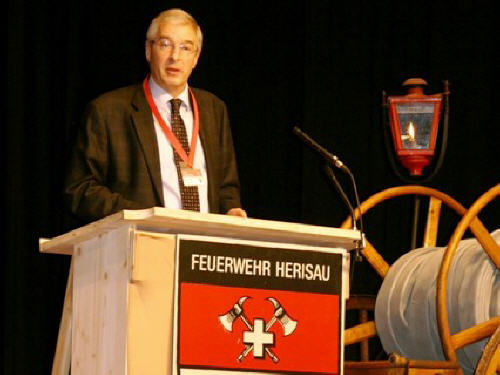 Es folgten kurzweilige Reden von Regierungsrat und Assekuranzvorsteher Hans Diem und Gemeindepräsident Paul Signer. Dieser rechnete im Vergleich mit dem Mannschaftsbestand von 1884 vor, dass der Feuerwehrangehörige heutzutage die Arbeit von damals über 18 Mann leisten muss und deshalb mehr als nur ein „Siebesiech“ sein muss. Laurent Wehrli, der Zentralpräsident des Schweizerischen Feuerwehr-Verbands, gratulierte seinen Kameraden zum Jubiläum. Er betonte die wichtige Rolle, die die Feuerwehr Herisau in der Geschichte des schweizerischen Feuerwehrwesens gespielt hat. Mit seiner Präsenz und der Anwesenheit von Zentralvorstandsmitglied Josef Signer wurde dieser Rolle würdig Rechnung getragen. Der Präsident des 1871 ebenfalls auf Initiative des RC Herisau gegründeten Appenzellischen Feuerwehrverbandes Walter Hasenfratz, schenkte der Feuerwehr Herisau „eine Zeit“, in Form einer geschnitzten Holzuhr.