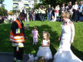 Am Samstag 16. August 2008 gaben sich Edith Stark und Roger Schläpfer in der ref. Kirche in Herisau das JA-Wort. Unser Kommandant erhielt im Anschluss im Casino-Park den Auftrag einer Personenrettung mit der ADL. Er war völlig überrascht, als er feststellte, dass es sich um die Braut handelte. Die Gerettete wurde nach dem Einstieg in den Rettungskorb geküsst. Dieser Akt soll jedoch nicht in die Standardausbildung aufgenommen werden, wie er anschliessend im Interview verriet. Das Geschenk - eine Kiste enthaltend: gravierter Hydrant, gravierte Gläser, Wein - musste er mit Long-Line abholen und in einer Punktlandung der Braut überführen.