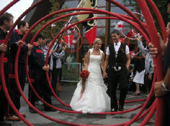 Am Samstag 22. August 2009 gaben sich Barbara und Christian Bischofberger in der Kappelle auf der Schwägalp das JA-Wort. Nachdem das Brautpaar das Spalier geniessen durfte, wurden sie mit unserem Oldtimer Dodge von der Schwägalp nach Urnäsch gefahren. Beim anschliessenden Apéro wurden die besten Glückwünsche überbracht. Während dem Zäuerli des Feuerwehrchörli's brach auf einer Wiese ein kleiner Brand aus, den es wegen der Trockenheit sofort zu löschen galt. Das Brautpaar entschied sich für einen Zangenangriff mittels zweier Kübelspritzen. Der Löscherfolg von unserem tüchtigen Feuerwehrbräutigam erwies sich jedoch als gering, weil seine Kübelspritze manipuliert war (sie spritzt rückwärts). In der Zwischenzeit konnte Barbara den Brand erfolgreich eindämmen und für die Nachlöscharbeiten kam ihr Christian zu Hilfe.