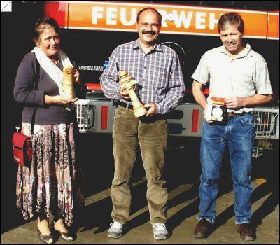 Gefragt war das Gewicht einer hydraulischen Rettungsschere. Mit 12,400 kg hat der Sieger auf das Gramm genau getippt. Die glücklichen Gewinner konnten nun im Feuerwehrdepot ihre Preise in Empfang nehmen. 1. Preis Hansueli Reich, Herisau (mitte), eine Pfeffermühle in Form eines Hydranten. 2. Preis Sophia Hansen, Urnäsch (links), ebenfalls eine Pfeffermühle in Form eines Hydranten und 3. Preis Josef Keller, Herisau (rechts), einen Rauchmelder (PR).