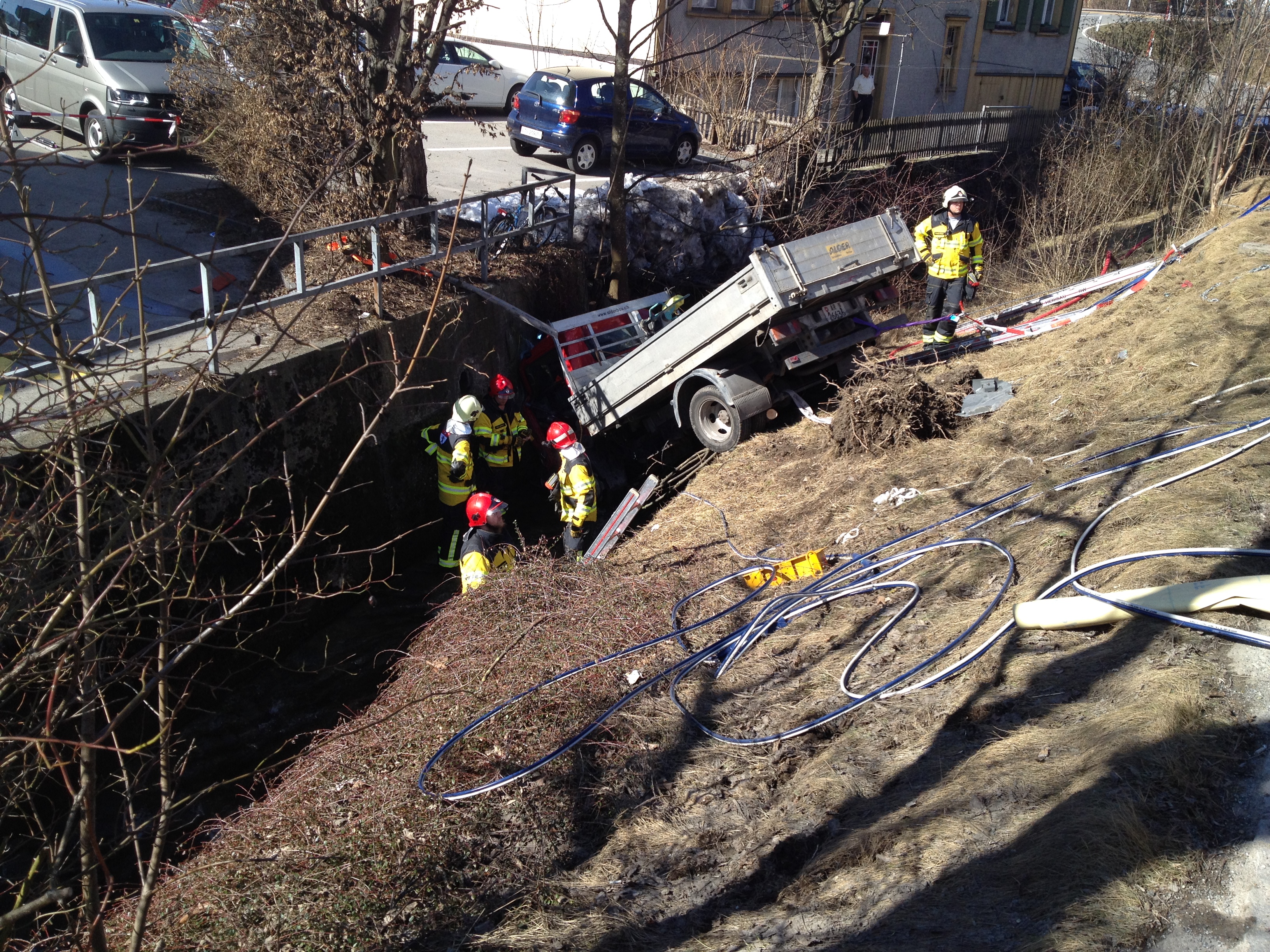 Massnahmen: Erkunden, Unfallstelle sichern, Strasse sperren, Lieferwagen gegen wegrutschen sichern, Ölsperren "Rhodiasorb" setzen, Lastwagen mit Kran aufbieten, Sichtschutz erstellen, eingeklemmte Person betreuen und aus Fahrzeug befreien, Verkehr grossräumig über Dorfzentrum umleiten, Beihilfe Fahrzeugbergung mit Kran, Strasse reinigen