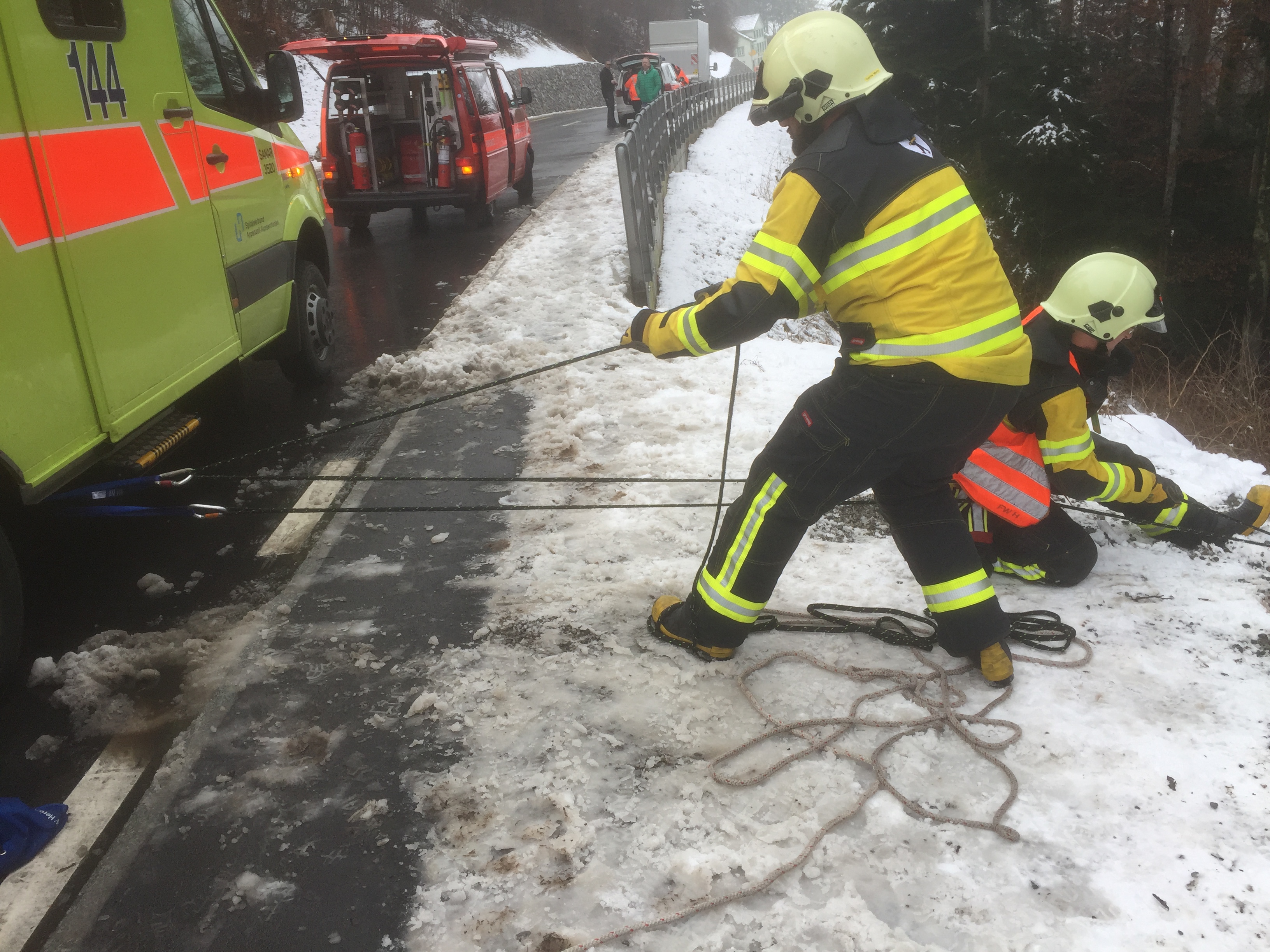 Massnahmen: 1. Patient mit Schleifkorbtrage und Flaschenzug heraufziehen; 2. Patient durch entfernen Frontscheibe befreien und mit Schleifkorbtrage heraufziehen; Mithilfe Fahrzeugbergung; Strassenreinigung