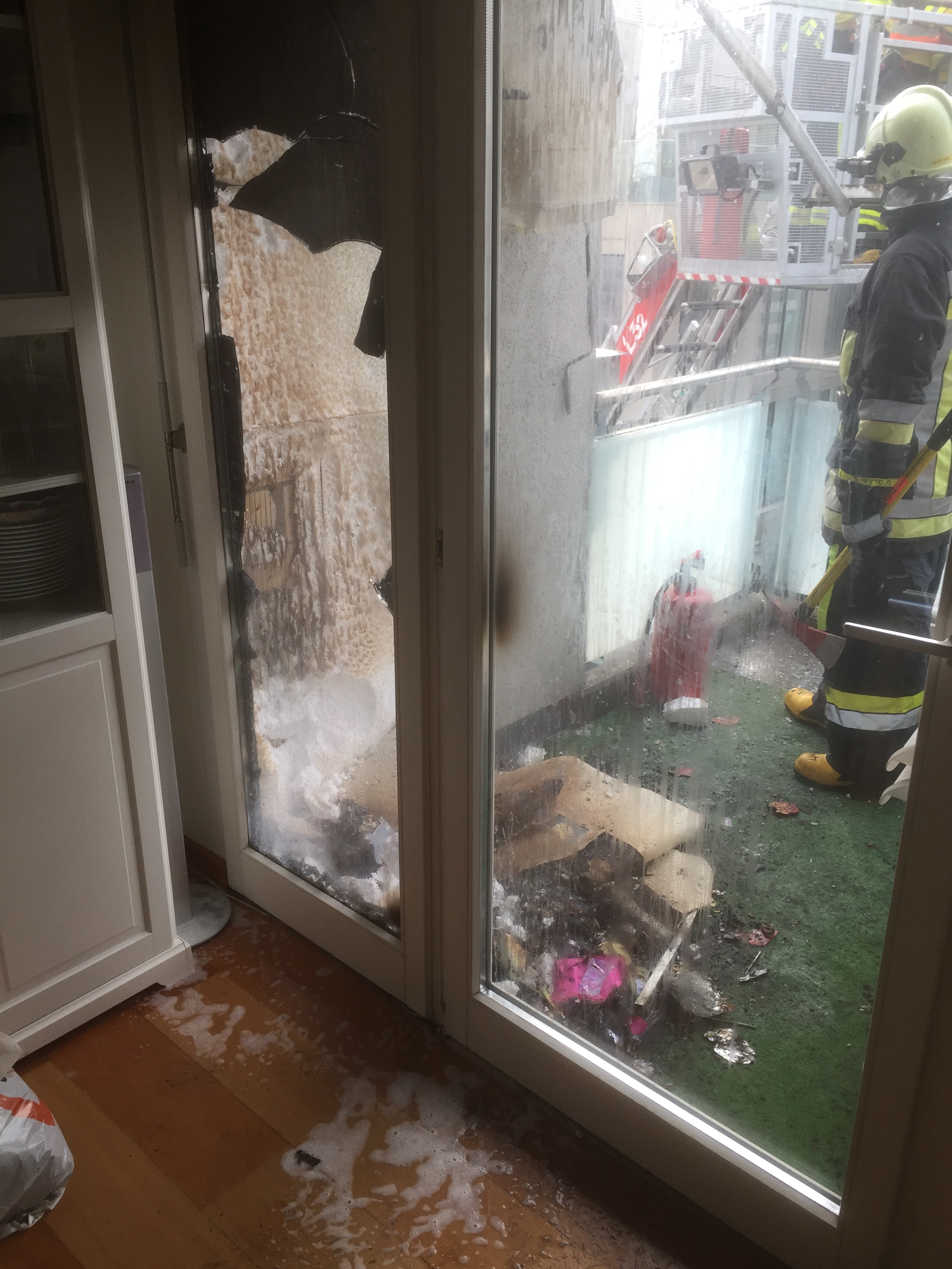 Lage beim Eintreffen: Rauch auf Balkon im 4. Obergeschoss, Türe verschlossen; Brand eines Gasgrills mit Gasflasche