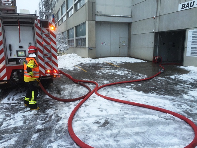 Massnahmen: Treppenhaus mit Lüfter in Überdruck versetzten; Brand löschen; Räume 1. Stock entrauchen mit drei Lüfter