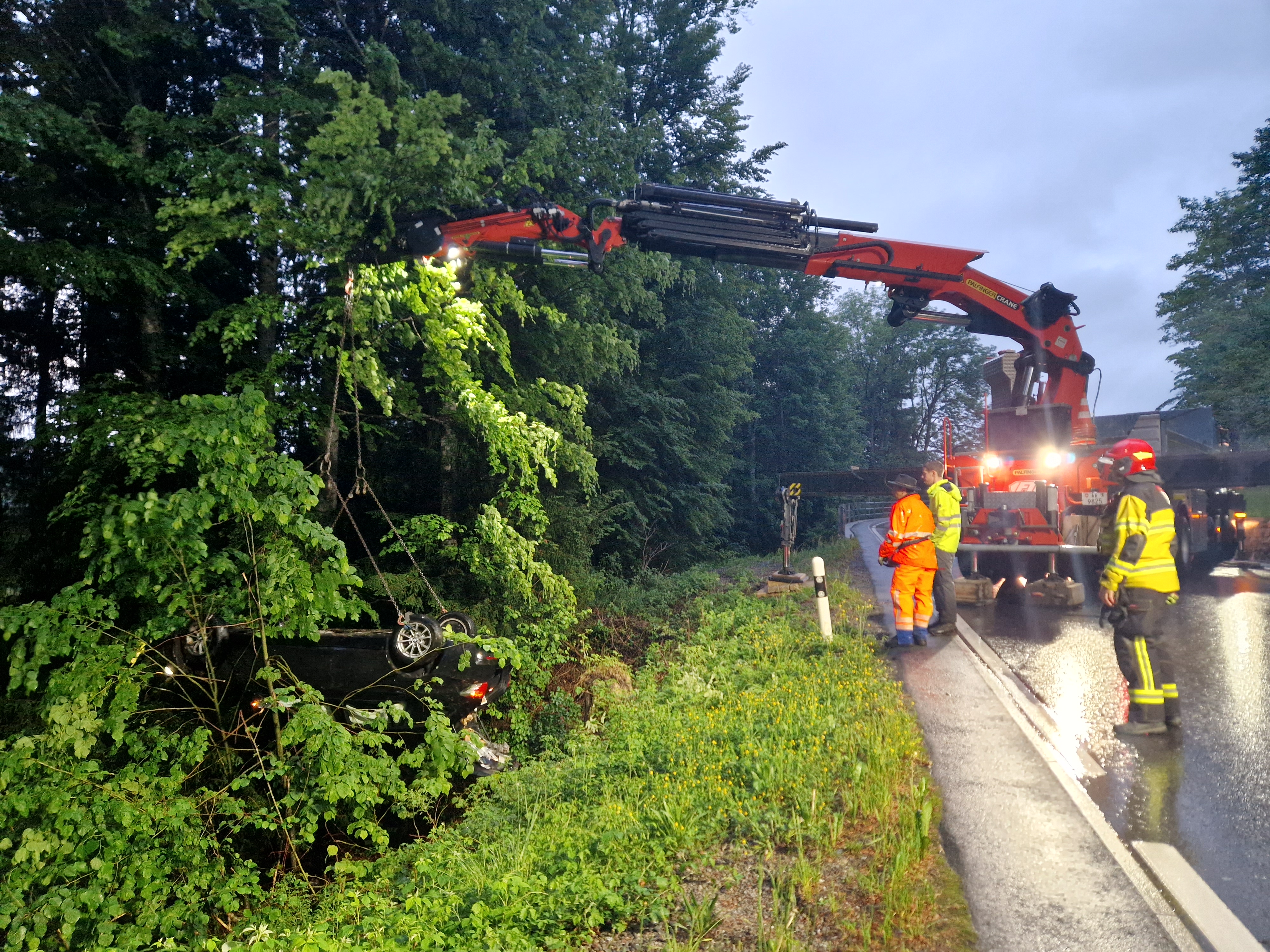 Massnahmen: Strasse sperren, Lenker mittels Schleifkorbtrage retten, Mithilfe bei Fahrzeugbergung, Strassensperrung aufheben
