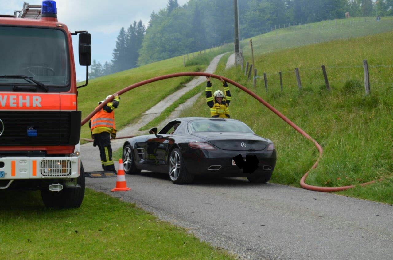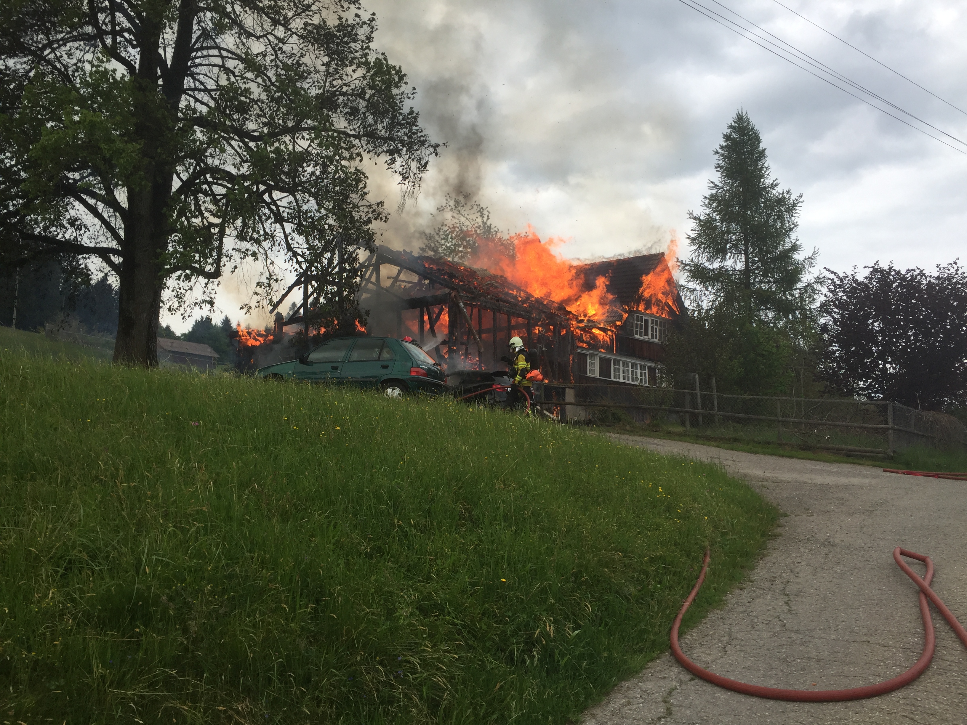 Lage beim Eintreffen: Vollbrand des angebauten ehemaligen Stalles; Brand im Dackstock des Wohnhauses; Brandübergriff auf Personenwagen