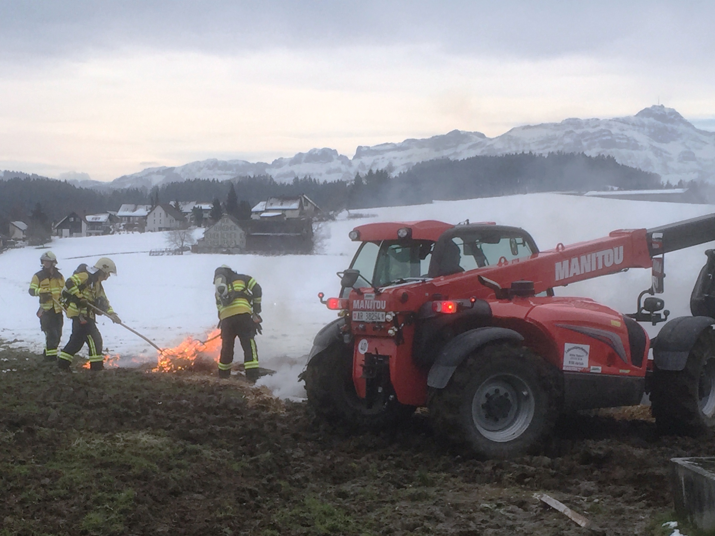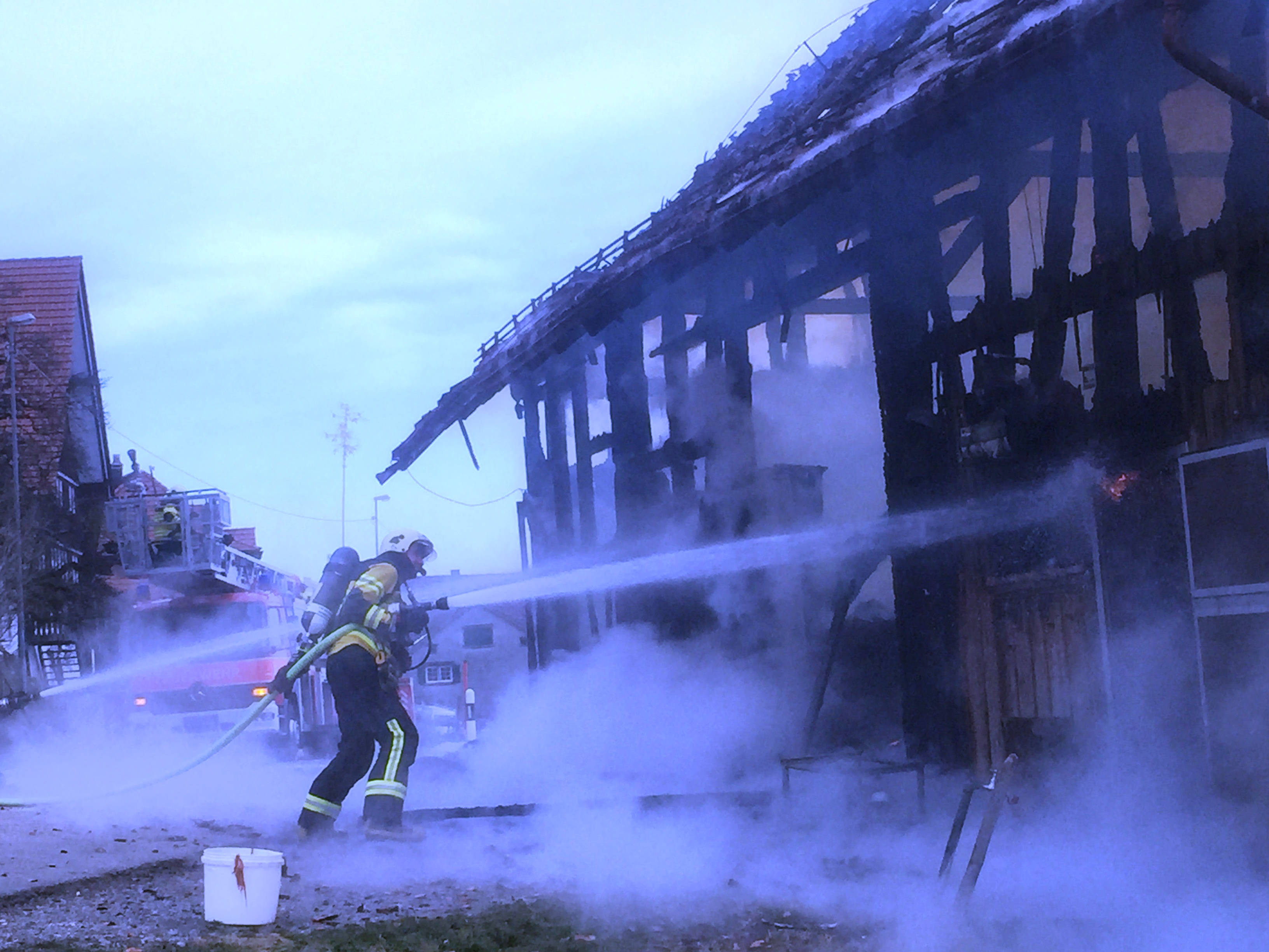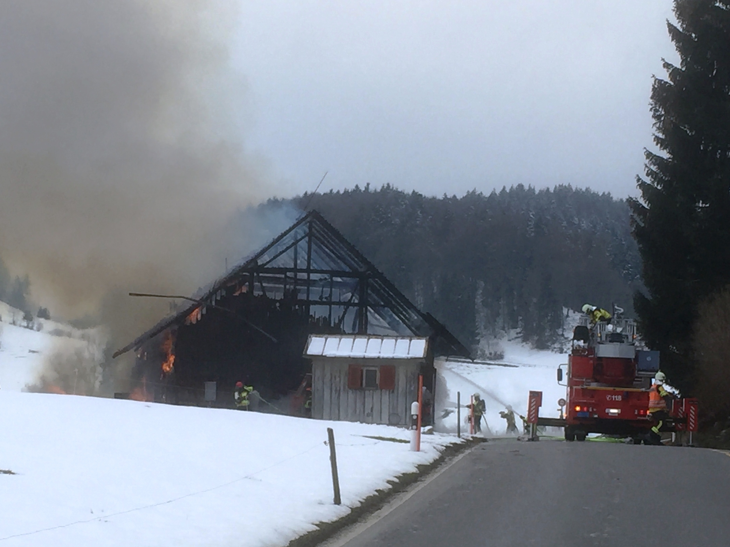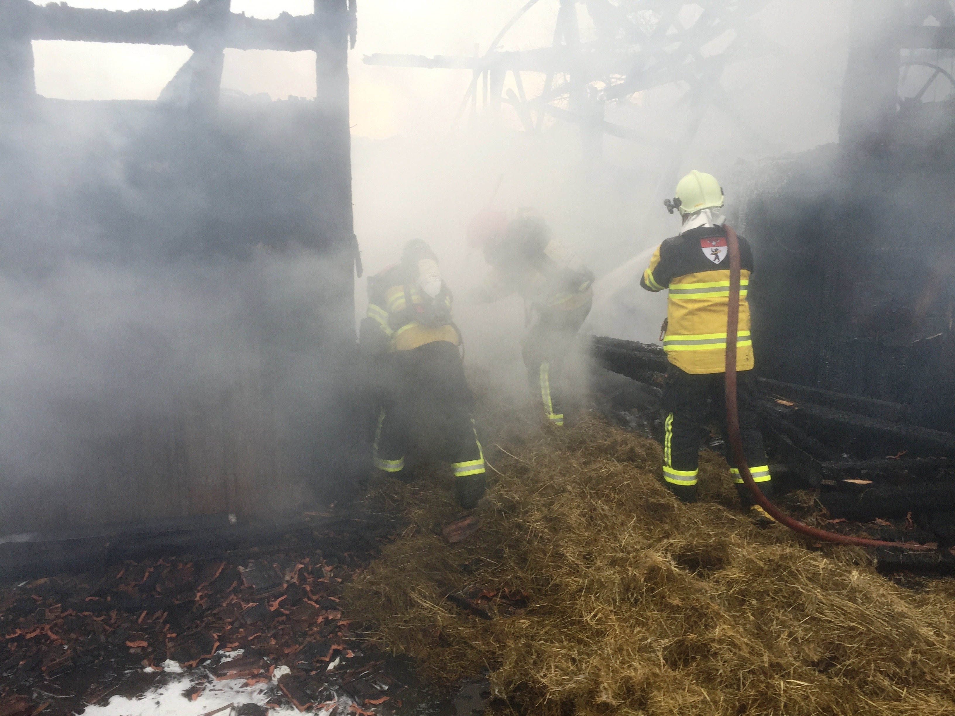 Massnahmen: Rettungsdienst aufbieten; Landwirt durch Alarm-Samariter betreuen; REGA-aufbieten; Huebstrasse Sperren und Umleiten; Gebäude stromlos machen und Wasserzuleitung abstellen; Gebäudebrand löschen; Einstürzende Gebäudeteile abbrechen/einreissen; Heustock/Stroh mit Manitou-Fahrzeug und mit Heugabeln aus Gebäude räumen und auf Wiese ablöschen. Beihilfe Tiere in anderen Stall zu überführen.