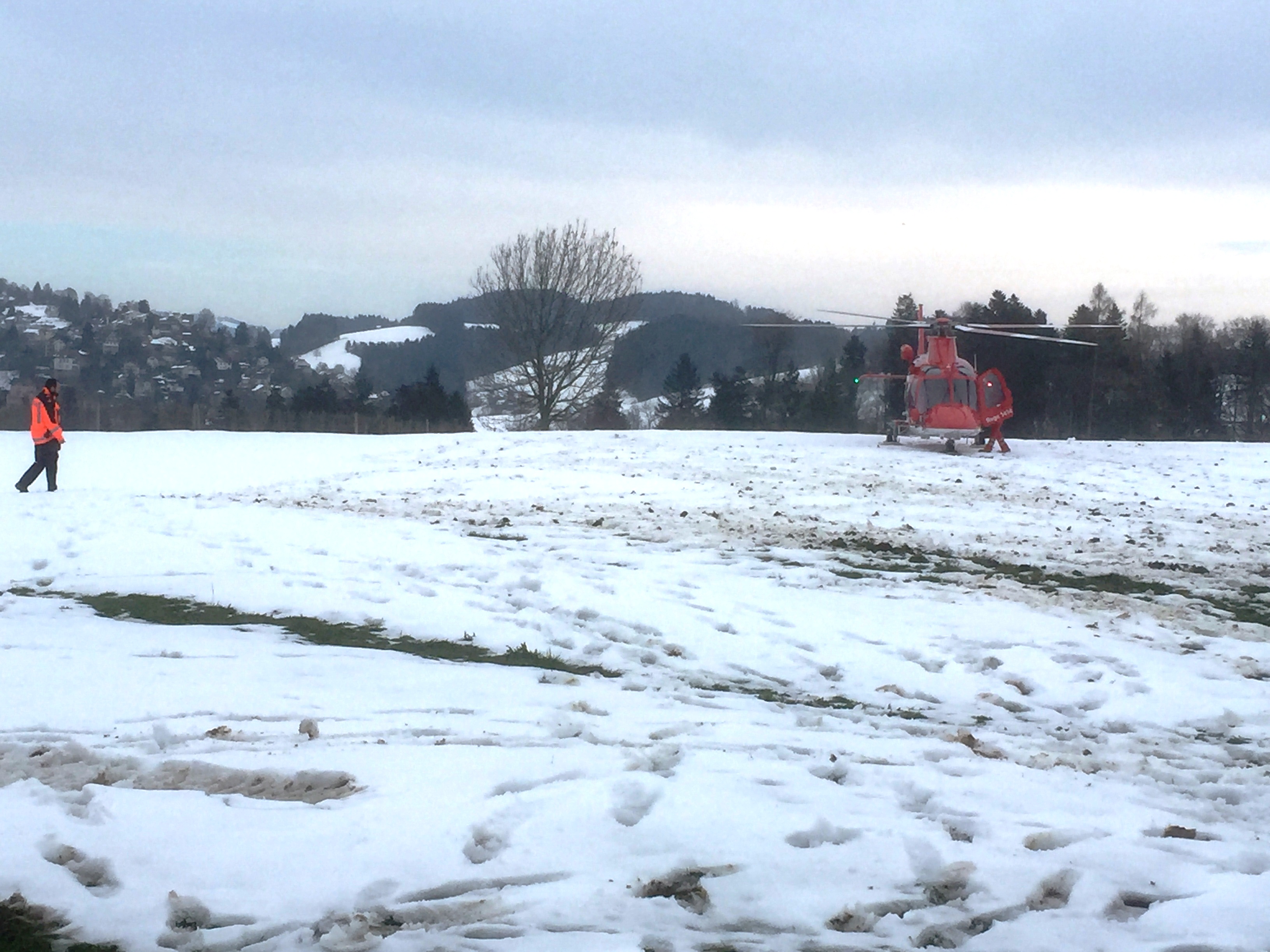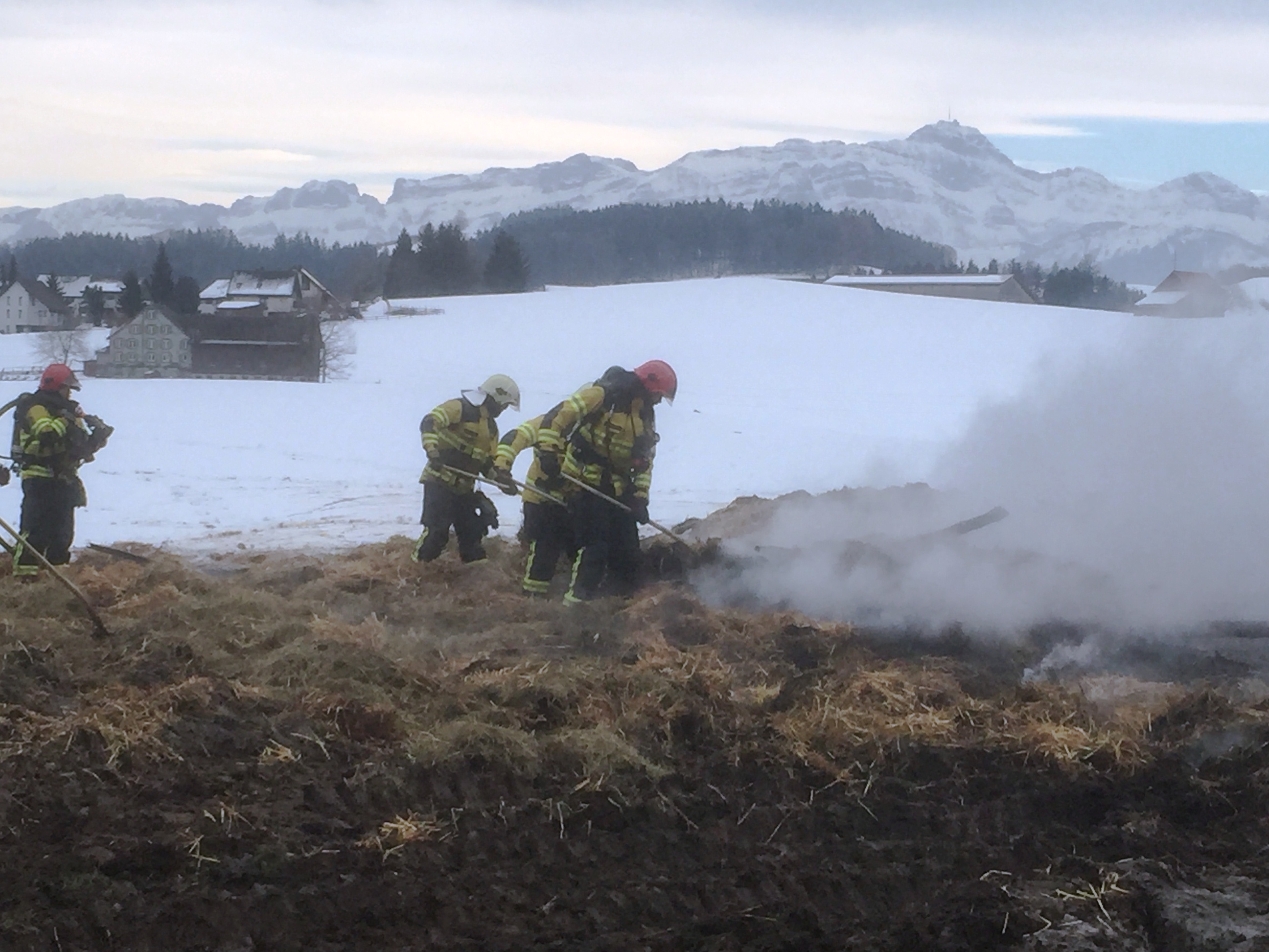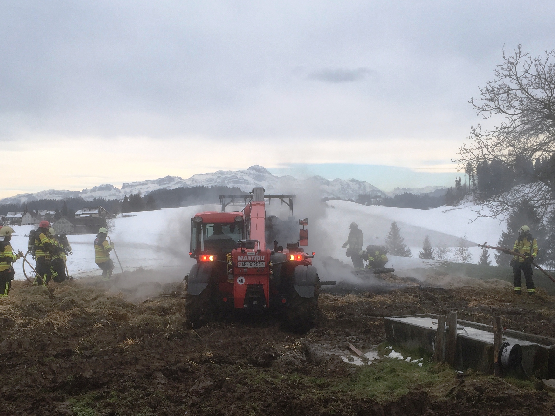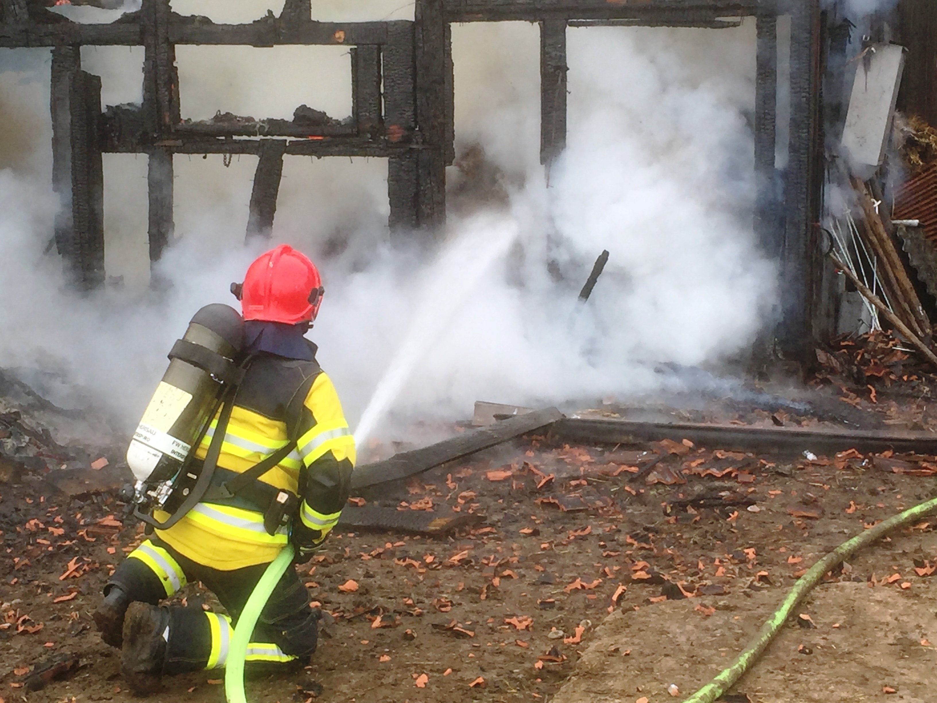 Massnahmen: Rettungsdienst aufbieten; Landwirt durch Alarm-Samariter betreuen; REGA-aufbieten; Huebstrasse Sperren und Umleiten; Gebäude stromlos machen und Wasserzuleitung abstellen; Gebäudebrand löschen; Einstürzende Gebäudeteile abbrechen/einreissen; Heustock/Stroh mit Manitou-Fahrzeug und mit Heugabeln aus Gebäude räumen und auf Wiese ablöschen. Beihilfe Tiere in anderen Stall zu überführen.