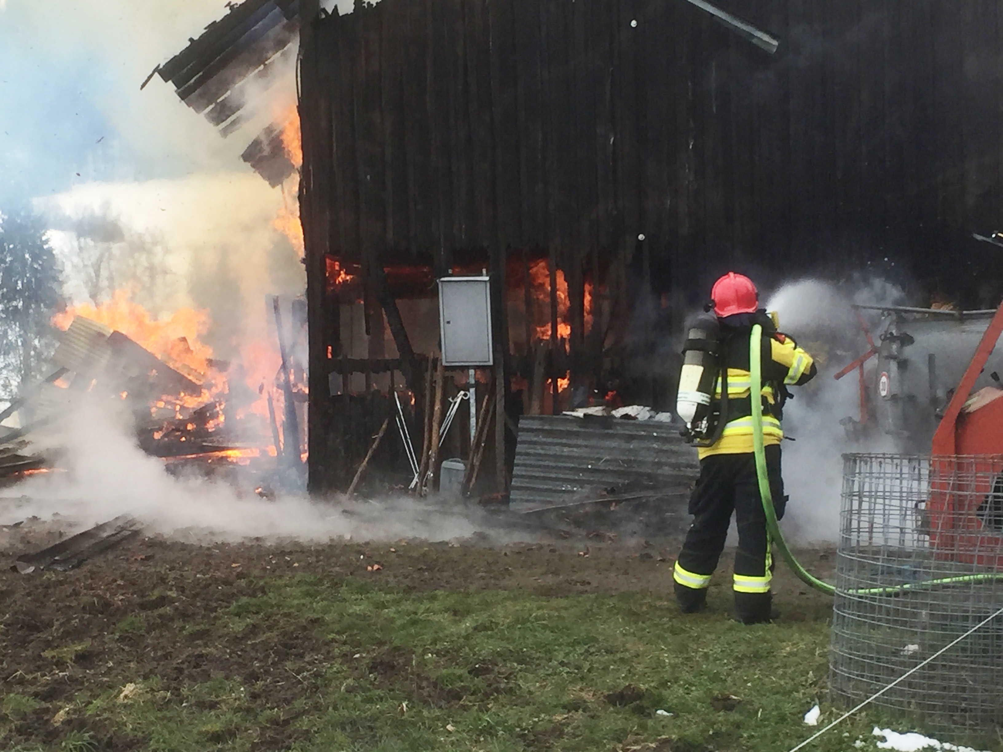 Lage beim Eintreffen: Scheune mit Stall im Vollbrand, keine Personen und Tiere mehr im Gebäude, Landwirt mit Brandverletzungen