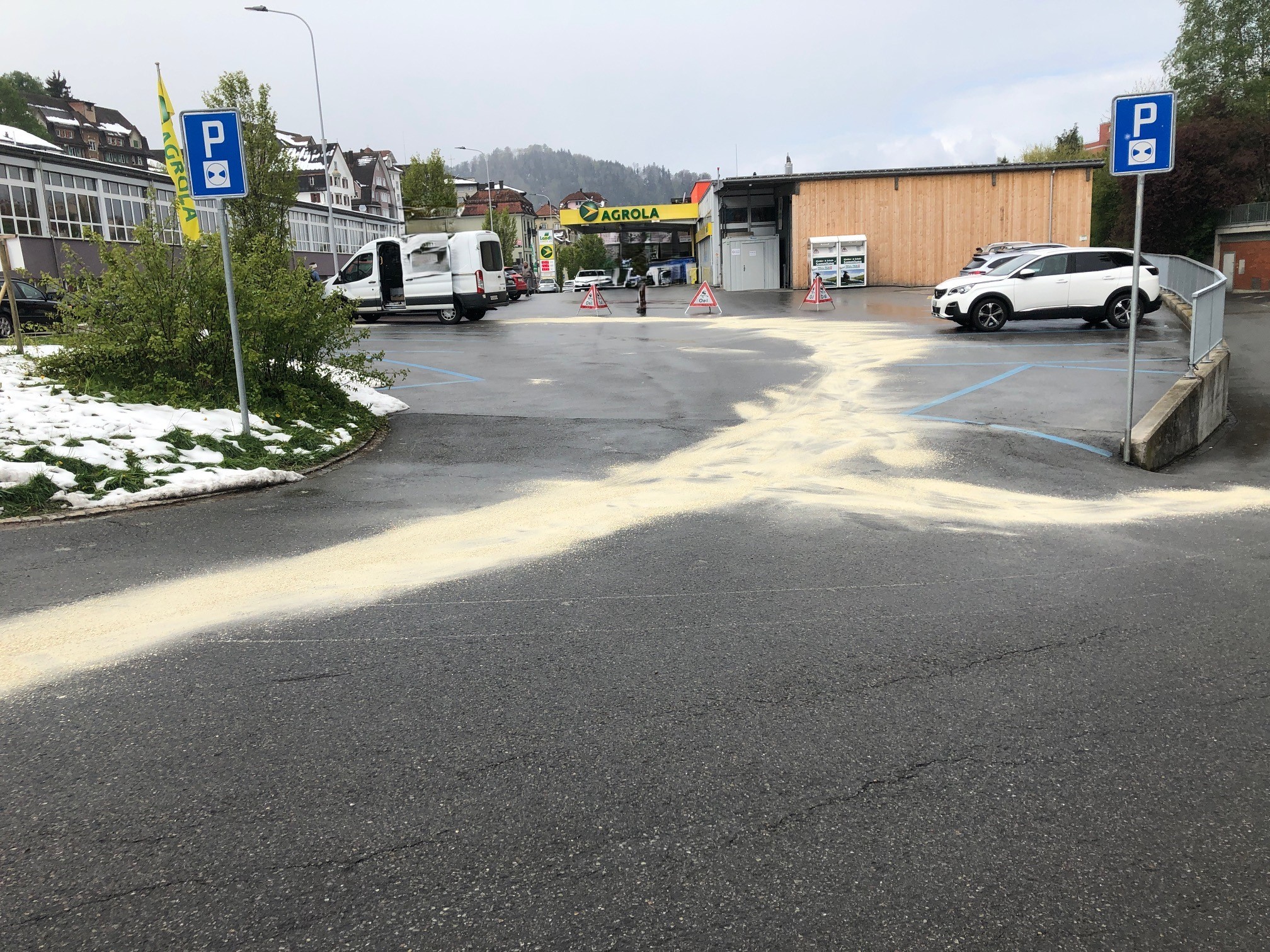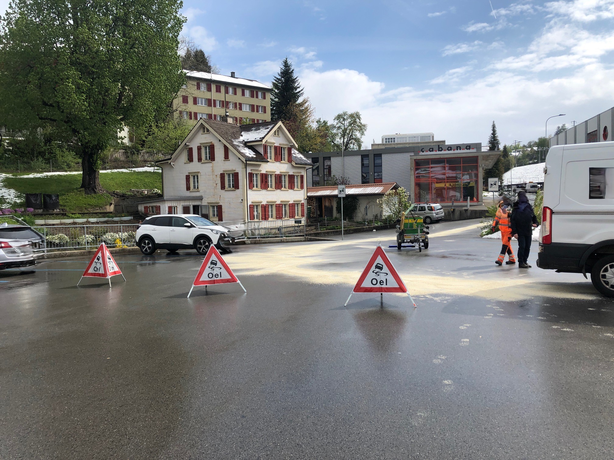 Massnahmen: Einfahrt sperren, Dieselspur mit Bindemittel abstreuen, Aufgebot Strassenkehrmaschine, Mithilfe bei Fahrzeugbergung, Reinigung des Parkplatz, Rückzug