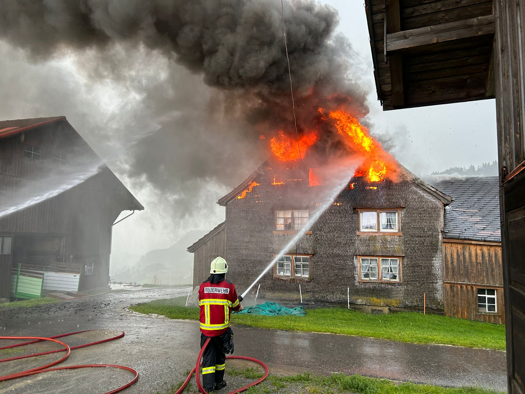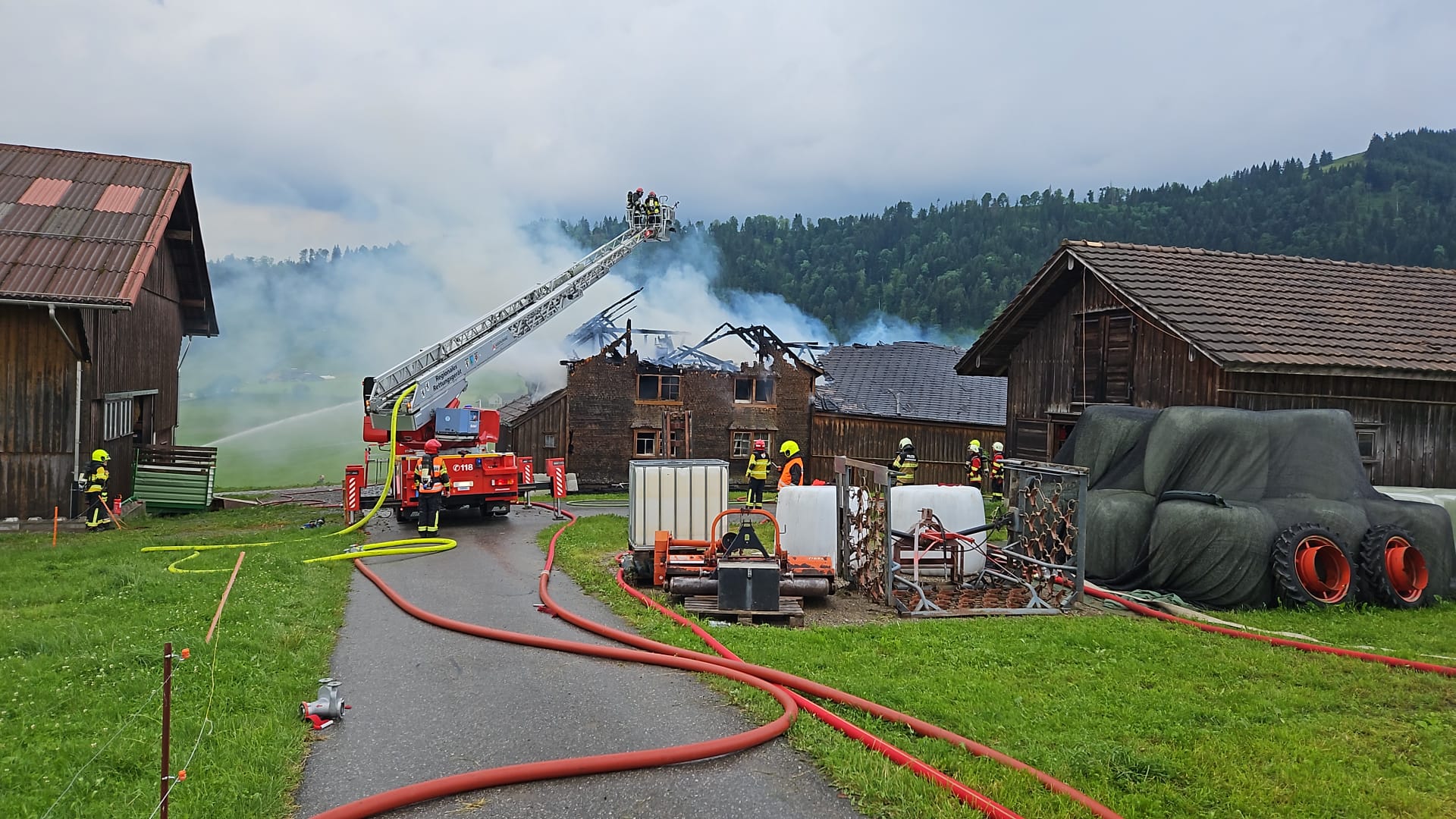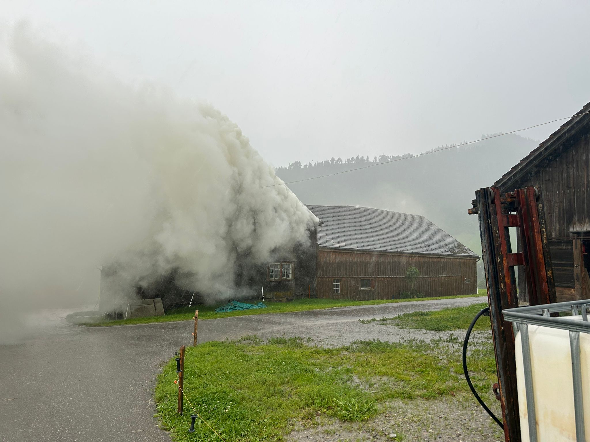 Lage beim Eintreffen: FW Hundwil und Rettungsdienst vor Ort, Wohnhaus brennt, Tierrettungen laufen
