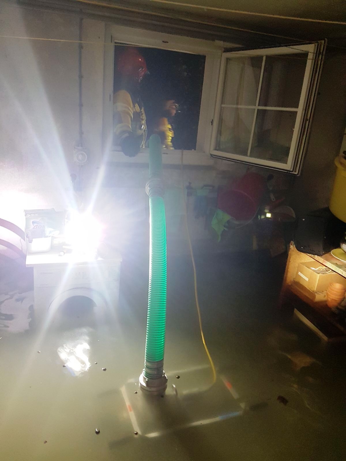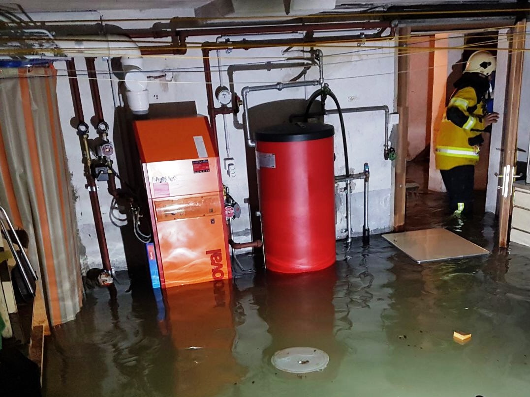 Lage beim Eintreffen: Polizei vor Ort; ca. 80 cm Wasser im Keller, Wasserstand noch steigend