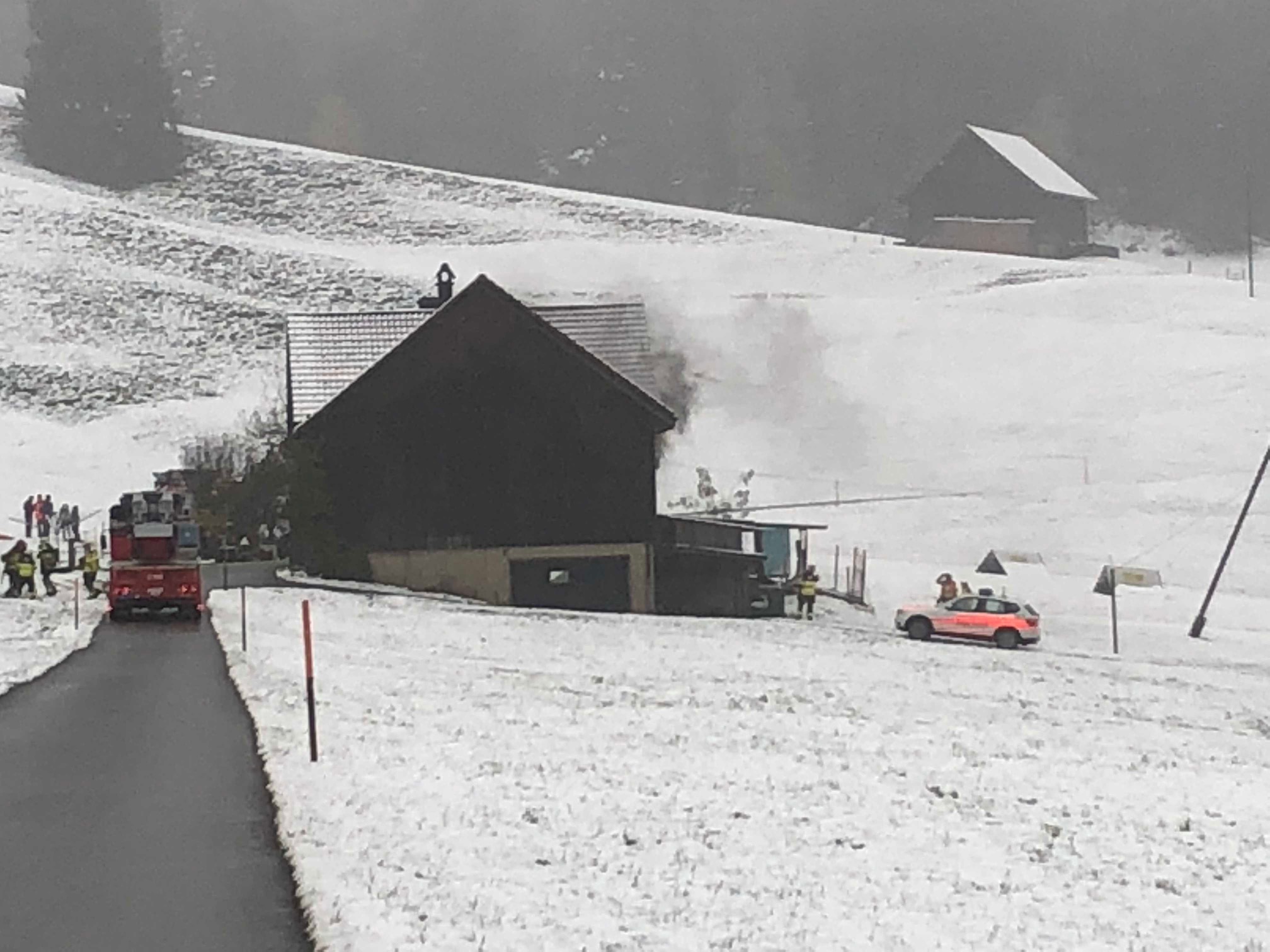Massnahmen: Aufgebot Wasserversorgung Schwellbrunn; Erkunden, Rauchvorhang setzen, Austrittsöffnung schaffen, Brand löschen, entrauchen mit Lüfter, Kontrolle mit Wärmebildkamera auf Glutnester