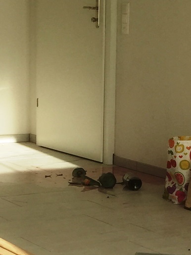 Lage beim Eintreffen: zerbrochene Glasflasche mit rötlicher Flüssigkeit in leerstehender Wohnung; ätzende Dämpfe in Wohnung und Treppenhaus