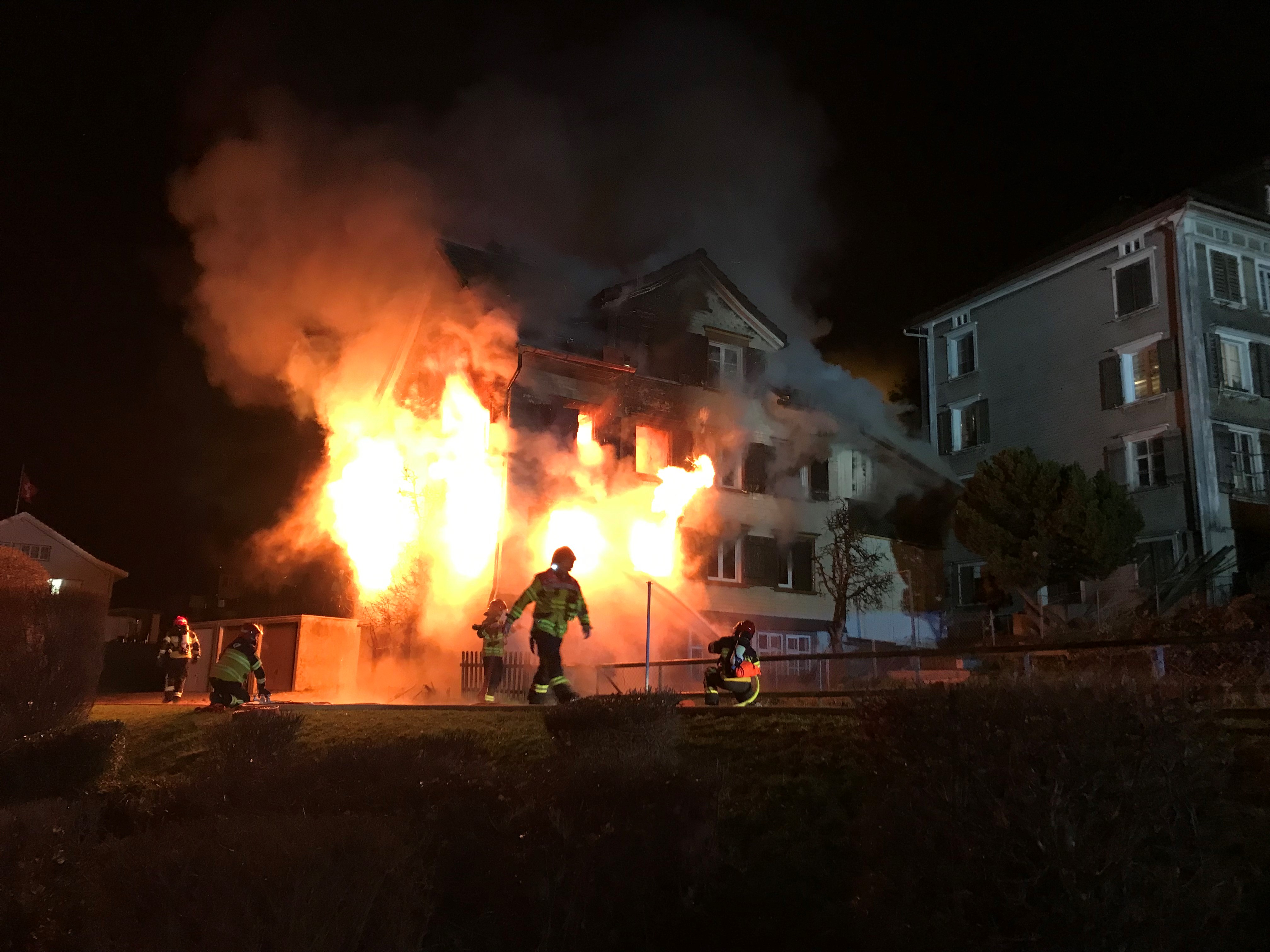 Massnahmen: Alarmstufenerhöhung auf 2, Strasse sichern, angrenzendes Wohnhaus mit Hydroschild schützen, Löschangriff mit div. AS Trupp, Brandbekämpfung über ADL Herisau und Gossau, Aufgebot Kranunternehmen für das abtragen des Brandschutt und Nachlöscharbeiten, Rückzug