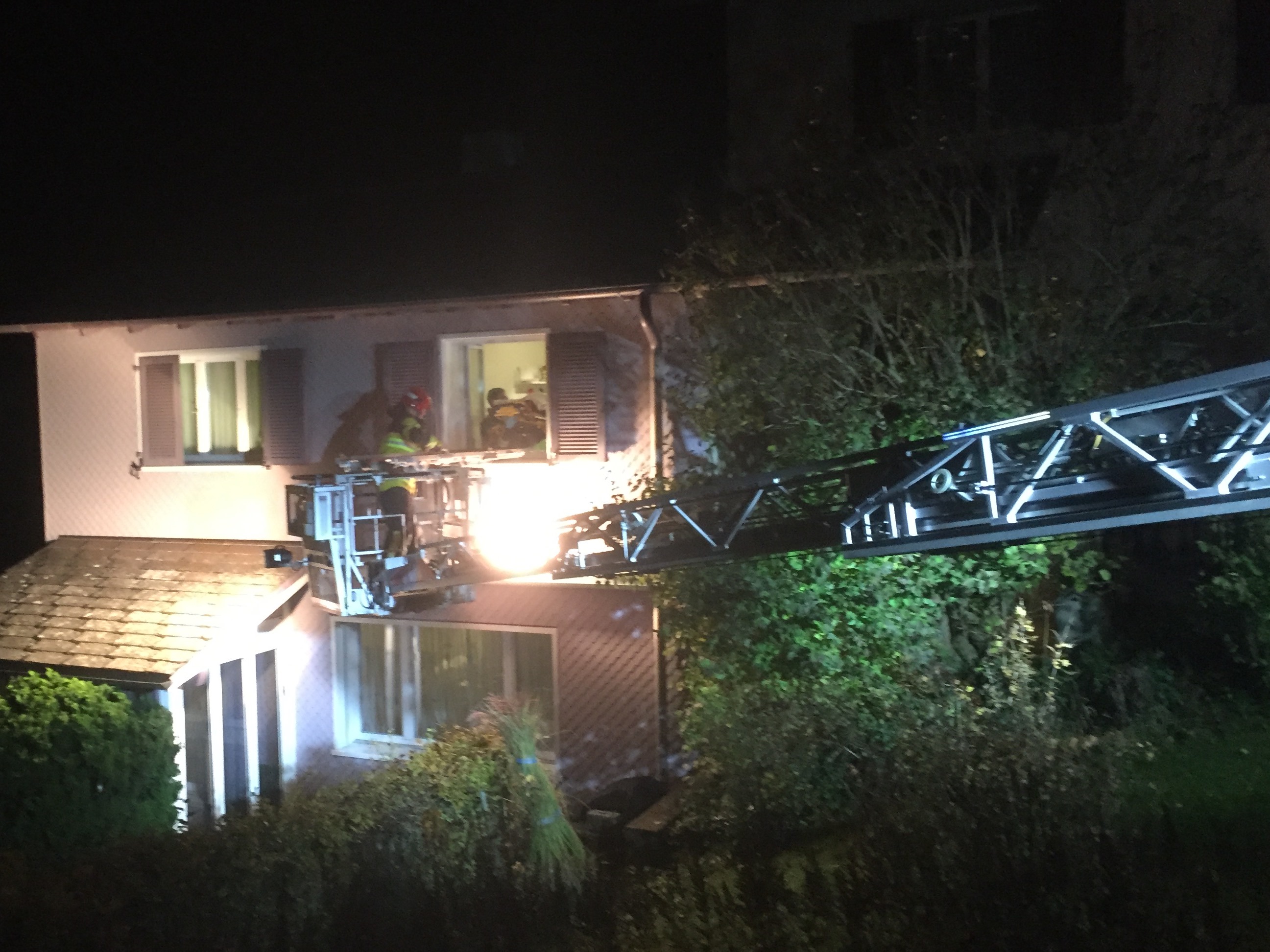 Massnahmen: Autodrehleiter mit Krankentragehalterung stellen und Patient aus 1. Obergeschoss Einfamilienhaus retten